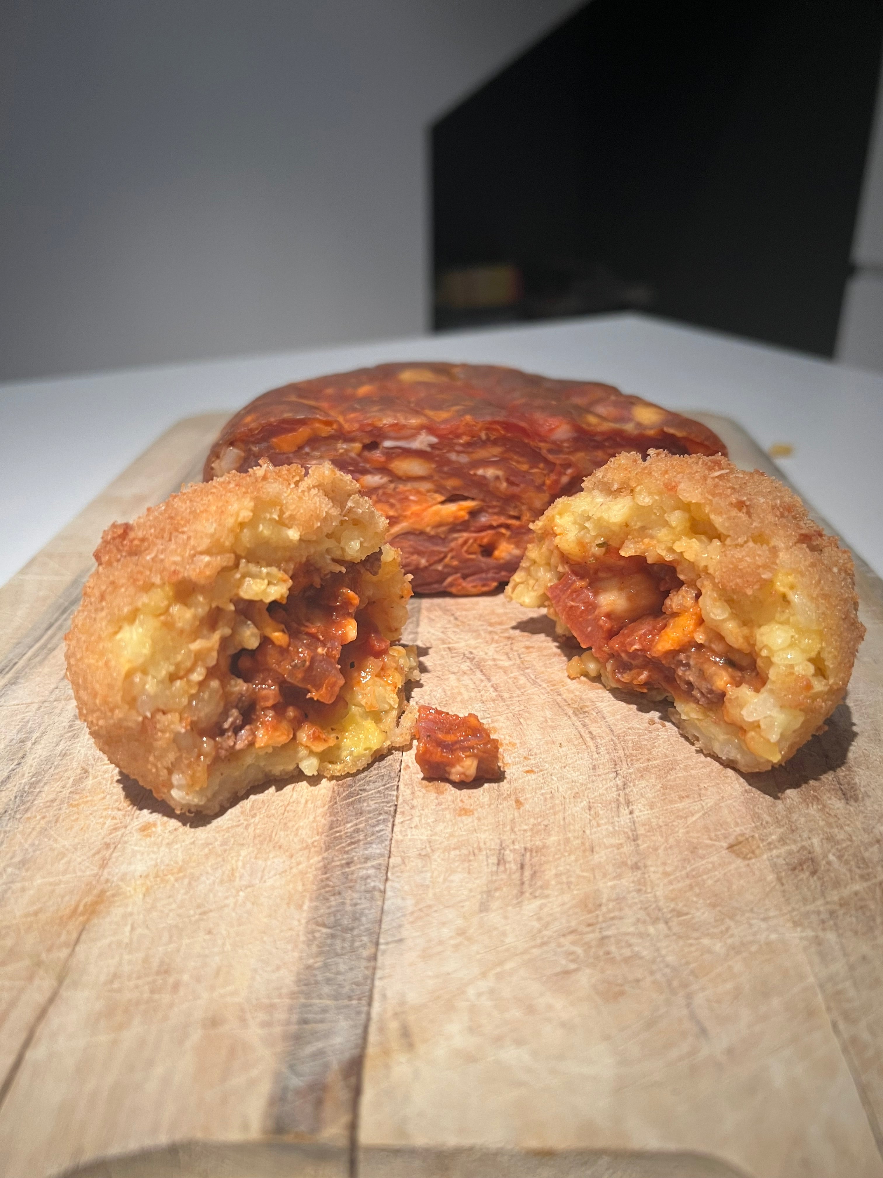 Ingrédients : Riz, parmesan, sauce tomate fraîche, spianata italienne, mozzarella, petits pois.